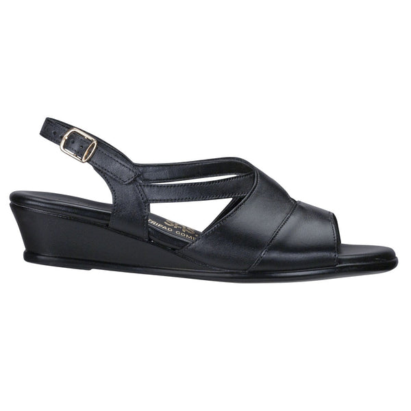 This sleek and elegant dress sandal has an elevated wedge sole and intricate design. Ample soft leather straps overlap to wrap the foot in comfort. A contoured insole follows the natural shape of the foot for support, while a flexible wedge heel offers shock-absorption. An adjustable back strap gently holds the heel in place.